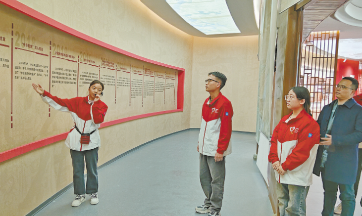 10月23日,2024届西部计划志愿者周敏(左一)在伊吾县下马崖乡铸牢中华民族共同体意识教育实践基地讲解。 石榴云/新疆日报记者 李琳 摄
