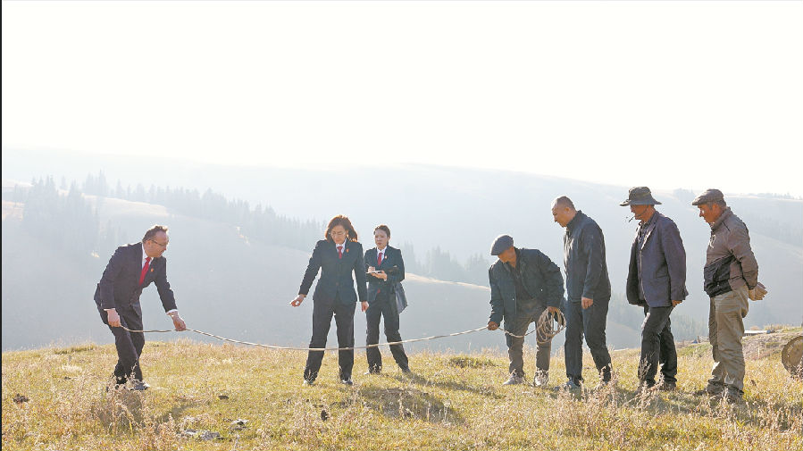 法官与当事人现场测量草场。 付肖 摄