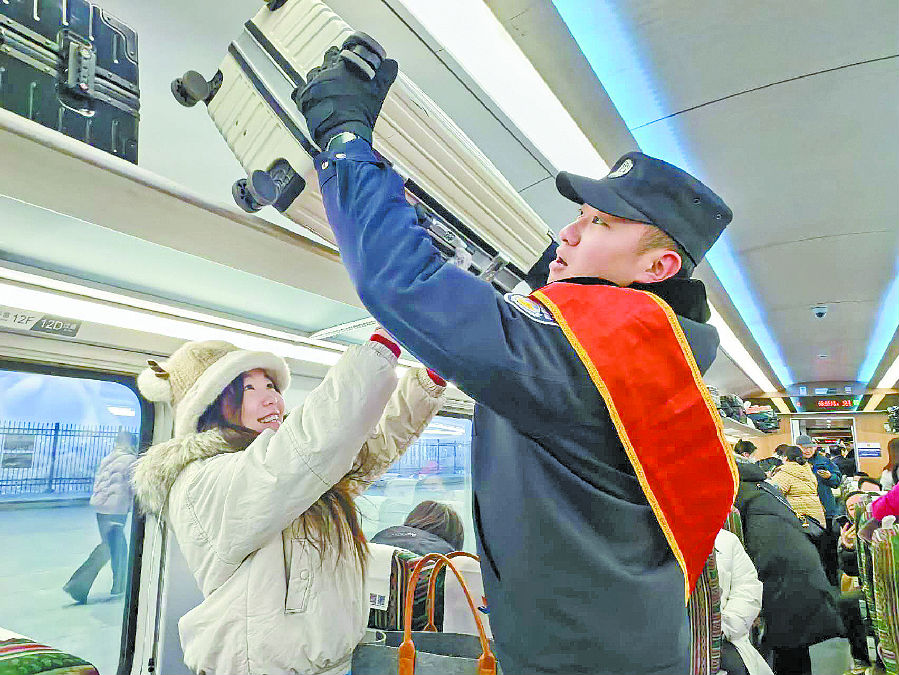 自1月14日春运启动以来,乌鲁木齐铁路公安局奎屯公安处克拉玛依站派出所组织青年民警开展志愿者活动,帮旅客搬运行李,开展普法宣传,护航旅客平安出行。图为该所民警帮旅客摆放行李。 朱芯欣 摄