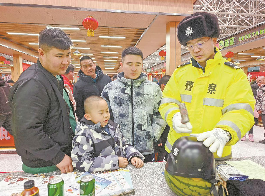 该大队民警以年货大集为契机,通过发放宣传资料及模拟演示等方式,向群众讲解春运期间出行注意事项,提醒大家要时刻把安全放在首位。图为民警向群众介绍戴头盔的重要性。 杜霖枫 摄