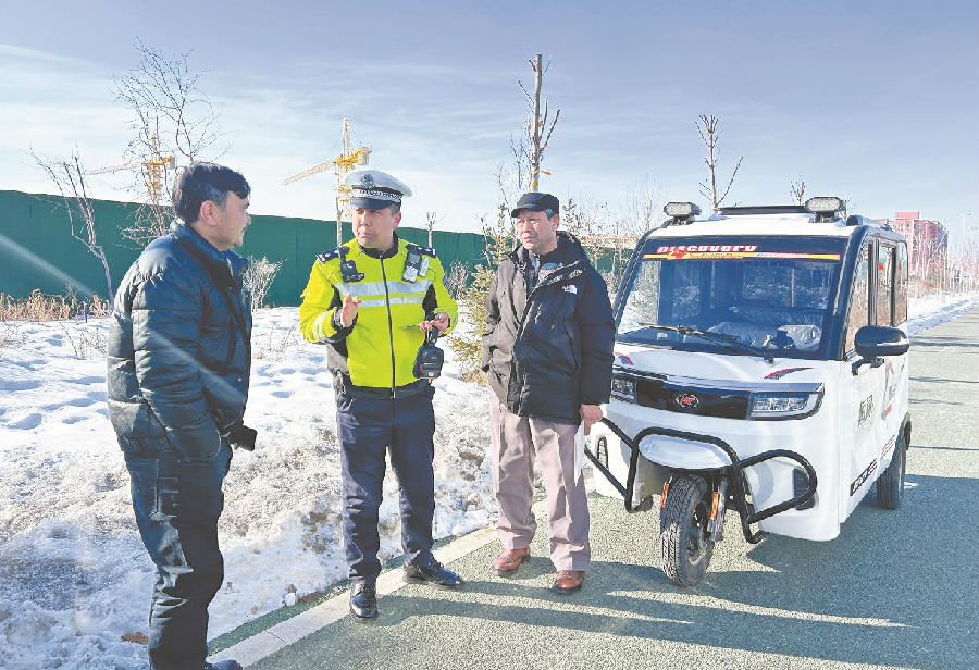民警向群众讲解骑乘电动三轮车的注意事项。 巴克尔·库尔曼江 摄