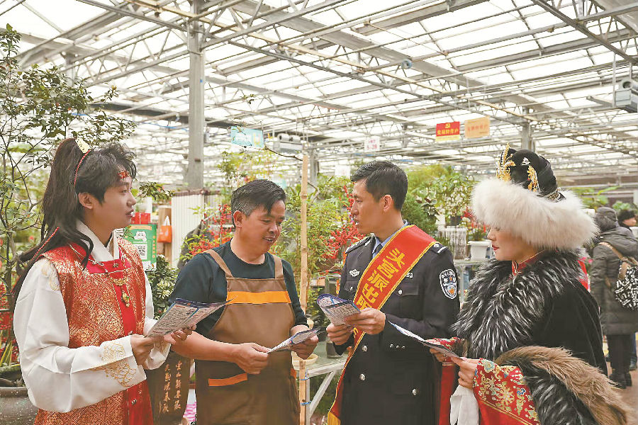 2月12日,新疆明珠花卉市场张灯结彩,热闹非凡。乌鲁木齐市公安局沙依巴克区分局头宫派出所联合该花卉市场举办“古装反诈游园会”,将《红楼梦》古装巡演与反诈宣传巧妙结合,向商户和市民宣讲防骗知识。 石榴云/新疆法治报记者 单坤 摄
