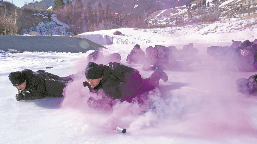 2月13日,乌鲁木齐市公安局警察教育训练支队初任班新警在冰面上匍匐前进。 王海平 摄