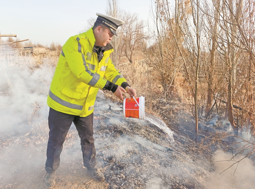2月21日18时,吐鲁番市高昌区公安局交警大队民警巡逻至亚尔镇色依迪汗村路段,发现路边的田地里冒出滚滚浓烟。民警立即下车查看,发现路边草丛起火,火势正在迅速蔓延。