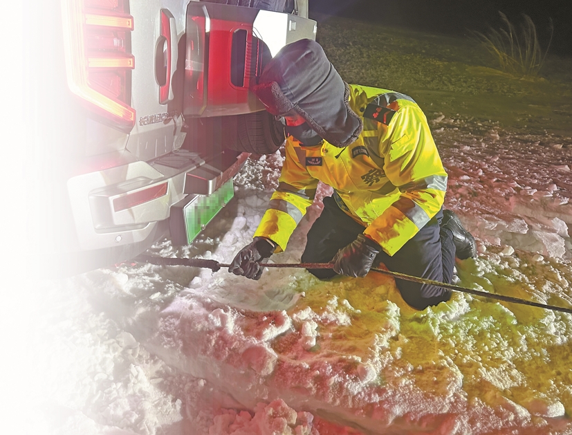 2月24日零时,托里县公安局交警大队民警在S318线381公里处救援被困车辆。 于娜娜 摄