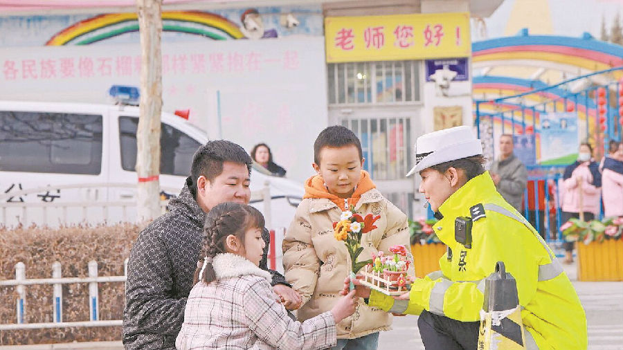 3月5日,古再努尔在护学岗执勤。一名家长带着两个孩子走来,孩子将自制的绢花送给她,用稚嫩的嗓音说:“交警姐姐,您辛苦了!”这让古再努尔感到一天的疲惫烟消云散。