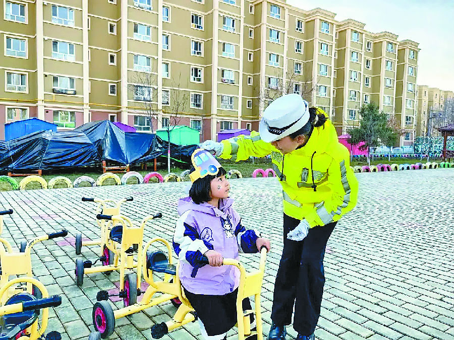 孜力奴热木·艾山江在辖区幼儿园开展交通安全宣传活动。 杨晓婷 摄