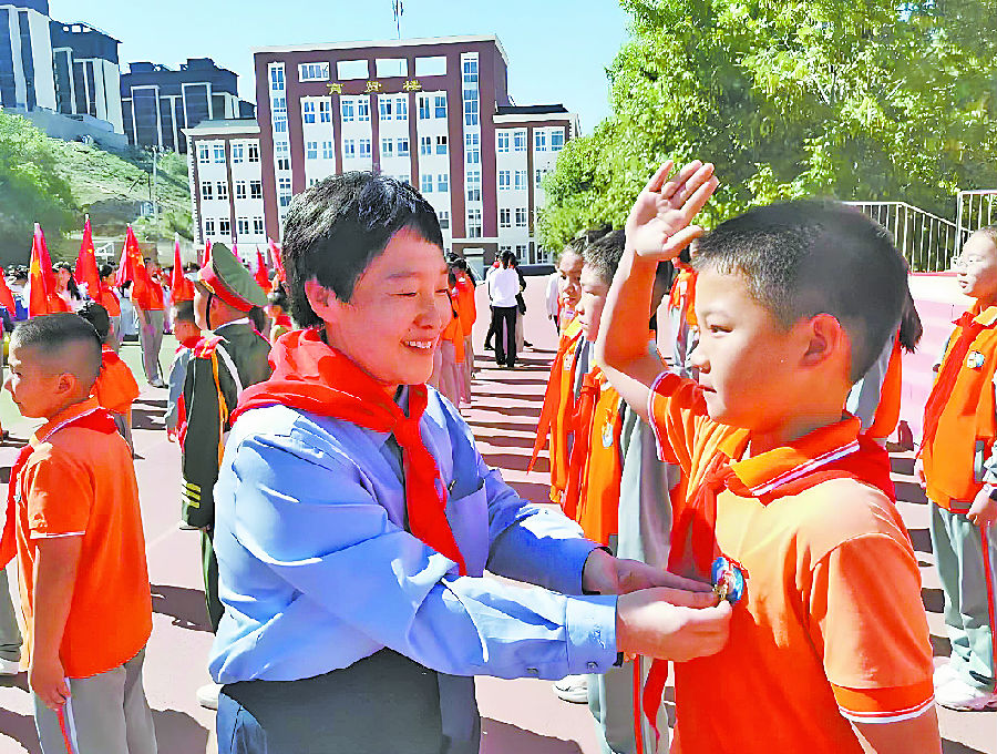 2024年6月,王群参加辖区学校举办的“六一”国际儿童节活动,为优秀少先队员佩戴五星勋章。 受访单位提供