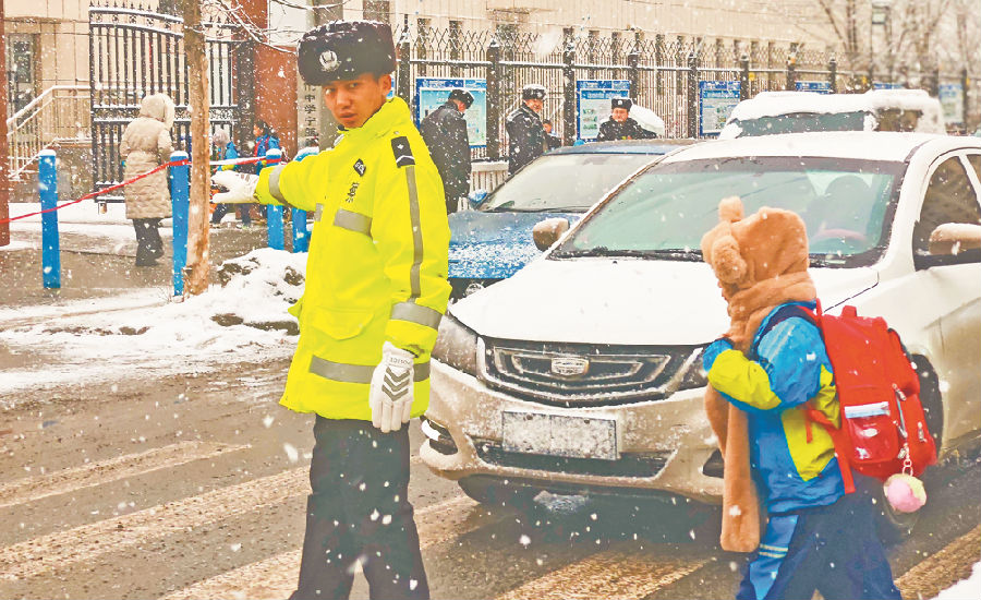 当日,乌市出现降雪天气,乌市公安局交警支队启动恶劣天气应急预案,民辅警全员上路执勤,全力保障道路交通安全畅通。 石榴云/新疆法治报记者 单坤 摄