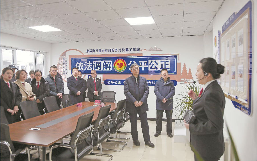2024年11月25日,参加乌鲁木齐市法院系统推进矛盾纠纷源头化解工作现场会人员参观米东区永祥街街道矛盾纠纷多元化解工作站。