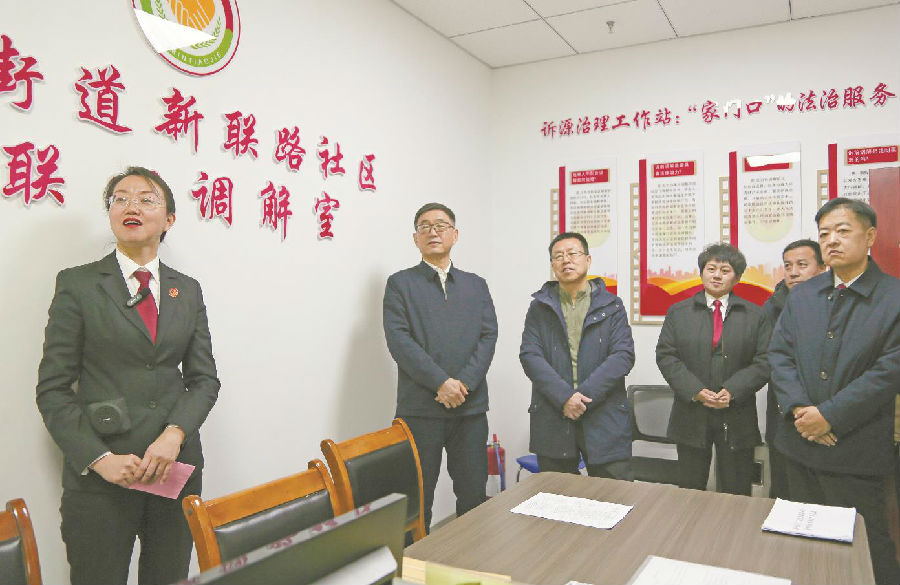 2024年11月25日,乌鲁木齐市中级人民法院党组书记、副院长崔文举(左二)一行,参观高新区(新市区)三工街道新联路社区矛盾纠纷化解诉源治理工作站。
