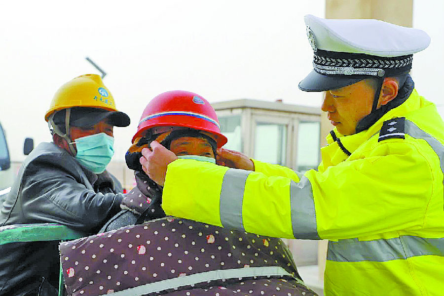 3月14日至16日,兵团第十四师昆玉市遭遇强风沙天气,部分路段能见度不足50米。和田垦区公安局交警大队启动恶劣天气应急预案,在漫天黄沙中指挥交通、开展安全提示、帮助受困群众。图为民警帮务工人员戴好安全头盔。 韩普 摄