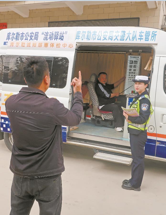4月21日,库尔勒市公安局交警大队在该市哈拉玉宫镇开设“流动车管所”,为当地群众办理车驾管业务,并结合当地道路通行特点讲解交通安全法律法规。