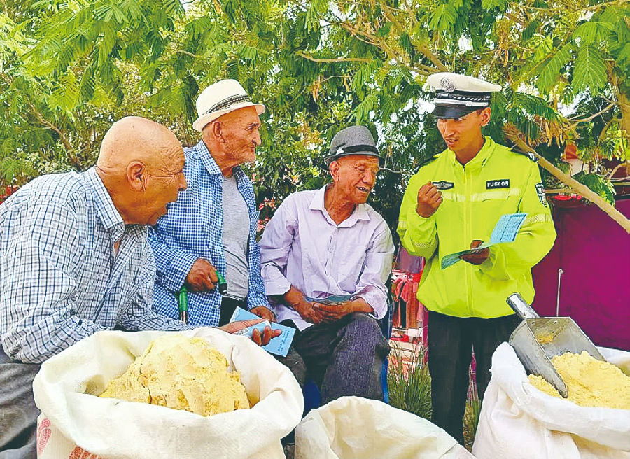 5月22日,兵团第十四师和田垦区公安局交警大队辅警为赶巴扎的群众讲解交通安全知识。当日,该大队将普法课堂搬进巴扎,民辅警设置宣传点、摆放宣传展板,讲解超速、超员、酒驾、无证驾驶等交通违法行为的危害,引导大家自觉遵守交通法规,确保自身和他人的生命财产安全。 高盼 摄