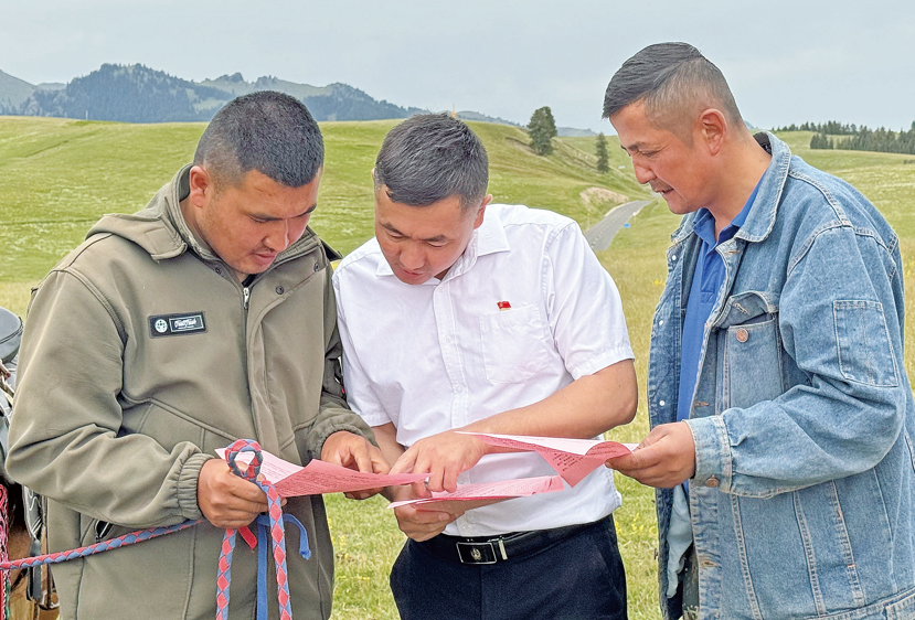 近日,木垒哈萨克自治县人民法院党员干警向牧民讲解环境保护相关知识。当日,该院开展“党旗映天山 法助公益行”主题党日暨普法宣传活动,党员干警来到马圈湾旅游景区,向牧民及游客普及《中华人民共和国草原法》等法律法规,引导大家爱护环境,文明旅游。 波塔·哈孜书 摄