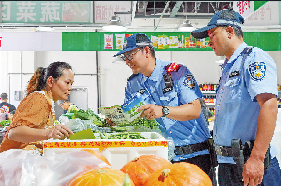 7月9日,乌鲁木齐市公安局经济技术开发区(头屯河区)分局白鸟湖派出所民辅警在白鸟湖农贸市场开展法治宣传活动,提醒群众及商户时刻保持警惕,增强自我防范意识,避免遭受不法侵害。