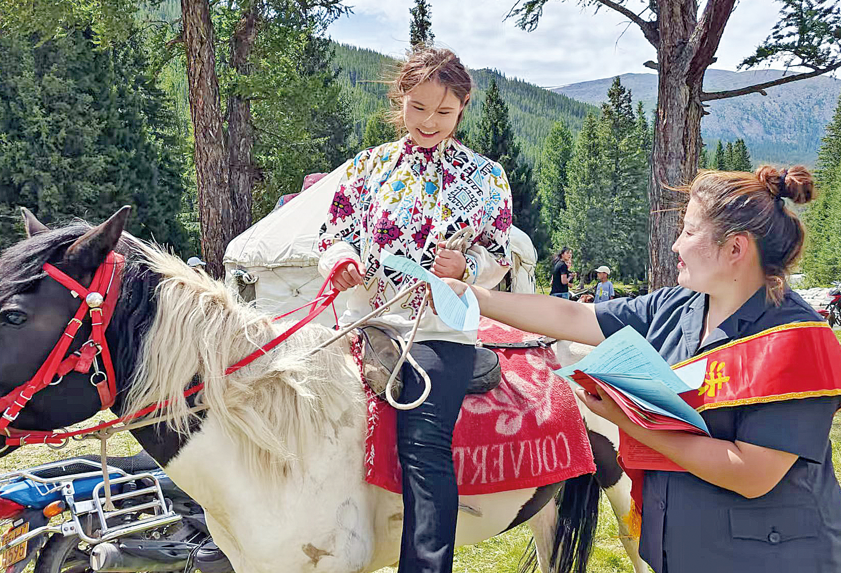 阿尔达克·木沙(右)向牧民宣讲法律知识。受访单位供图