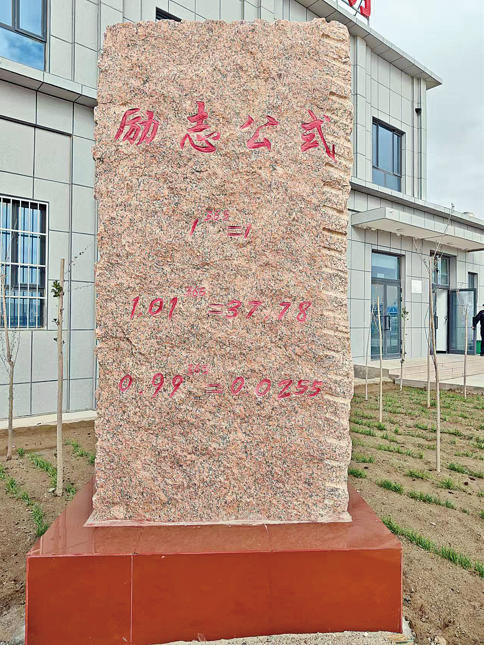 检查站大院楼前有一块石碑,上面刻着3个励志公式:“1365=1,1.01365≈37.78,0.99365≈0.0255”。侍淼介绍,“1”代表1天,后面的数字较“1”稍有增加或减少,这代表进步或退步的1天,“365”是一年的平均天数。
