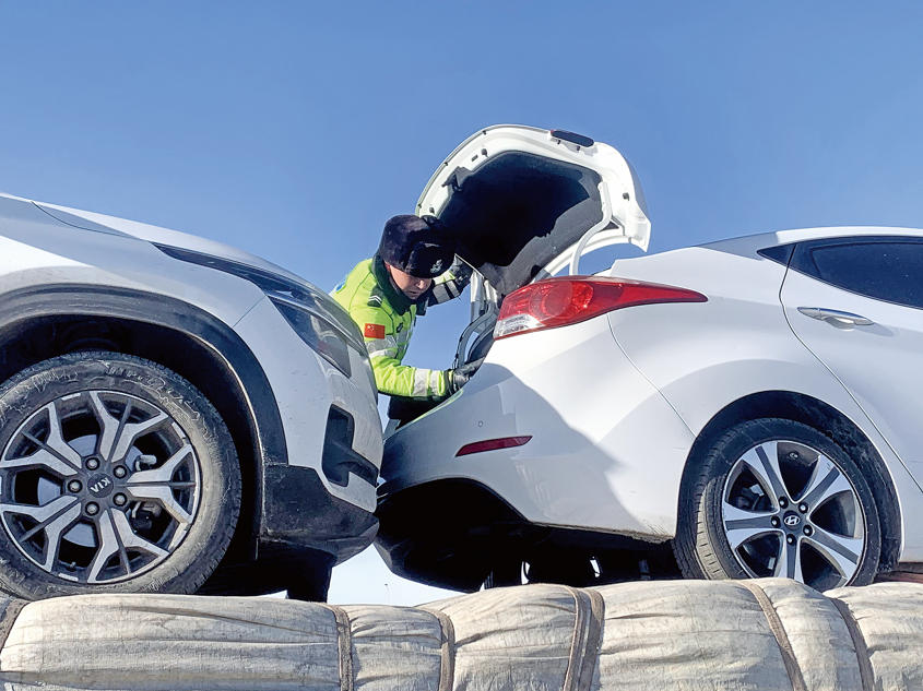 7月21日,一名辅警在检查车辆。邓发源 摄
