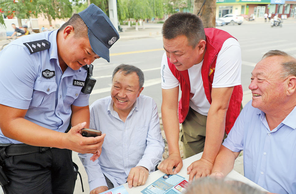 7月20日,“平安托里义警”队员和托里县公安局托里镇派出所民警,在复兴路社区教老人下载“国家反诈中心”APP。 张芳 摄