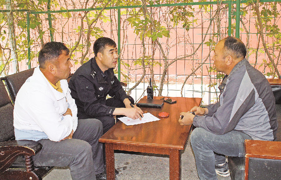 民警如扎洪·达吾提(中)调解工人之间的纠纷。 受访单位供图