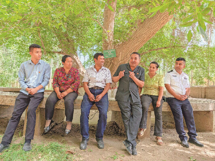 8月21日,皮山县人民法院桑株人民法庭庭长阿卜力米提·阿卜杜热曼(右三)受桑株镇社会治安综合治理中心委派,联合该镇司法所工作人员走进核桃种植园,调解一起因采收核桃引发的劳资纠纷。