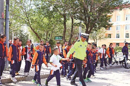 近日,青河县公安局交通管理大队民警护送学生过马路。