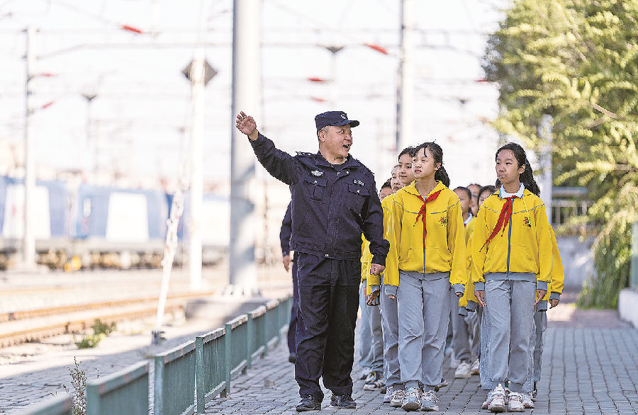 9月18日,乌鲁木齐铁路公安局乌鲁木齐公安处乌鲁木齐南站派出所、乌拉泊站派出所、警务支援支队(科信支队),邀请乌鲁木齐市雪莲小学的学生走进乌拉泊站,开展“知路爱路护路、共筑平安铁路”法治宣传教育活动。民警结合新疆铁路发展历程,向学生介绍不同年代铸造的铁轨,讲解铁轨的“构造秘密”,传递爱路护路理念。同时,民警结合近年来发生的真实案例,强调在铁路沿线嬉戏玩耍的危害性。图为9月18日,民警在站台安全线内向学生讲解铁路安全知识。