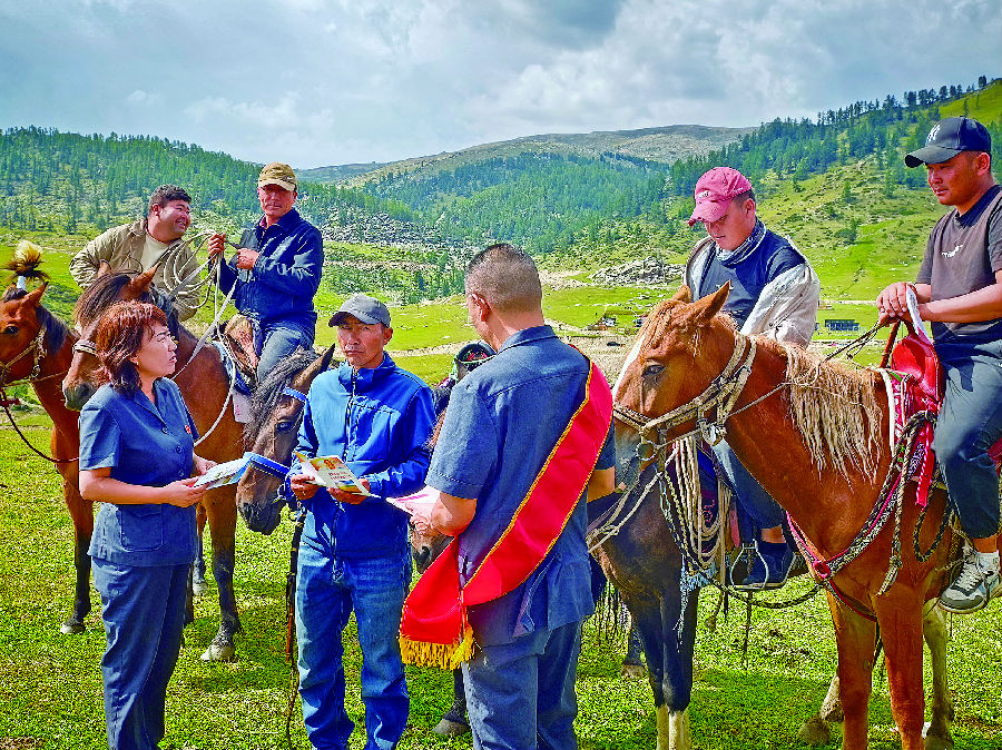 7月15日,阿勒泰市人民法院阿拉哈克人民法庭庭长热依扎·马迪汗(左一)和同事在牧区开展法治宣传。 石榴云/新疆法治报记者 齐琪 摄