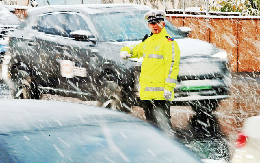 A+ | a10月15日,乌鲁木齐市公安局交通管理支队沙依巴克区大队友好路中队民警在雪中指挥交通。
