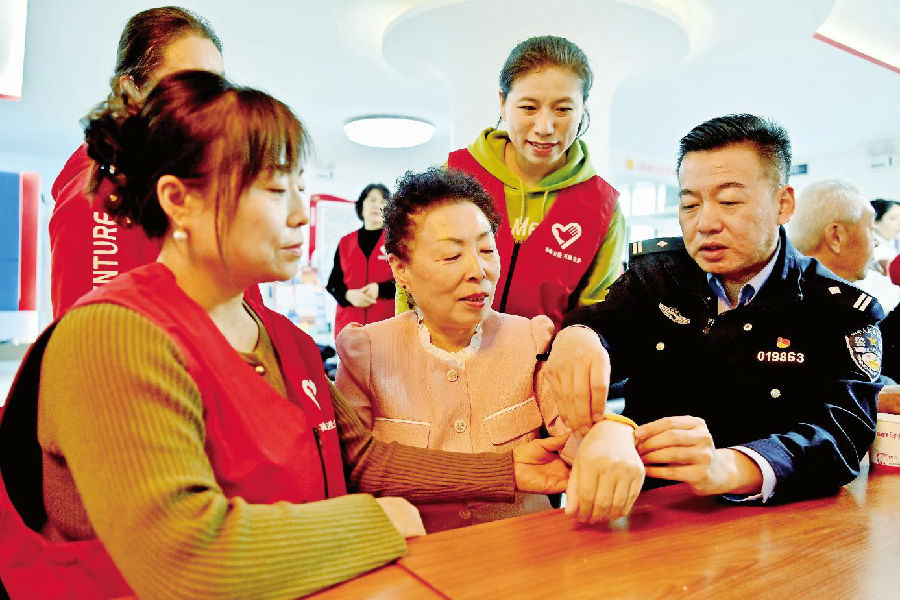 10月28日,民警和社区工作人员为老人戴上防走失黄手环。