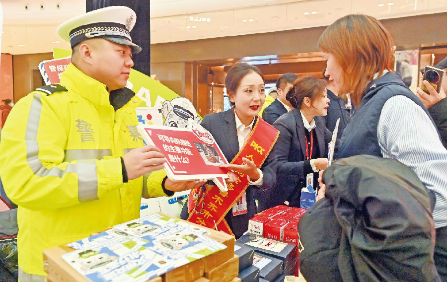 12月2日,在乌鲁木齐会展吾悦广场,乌鲁木齐市公安局交管支队水磨沟区大队民警与企业工作人员向群众宣讲交通安全知识。