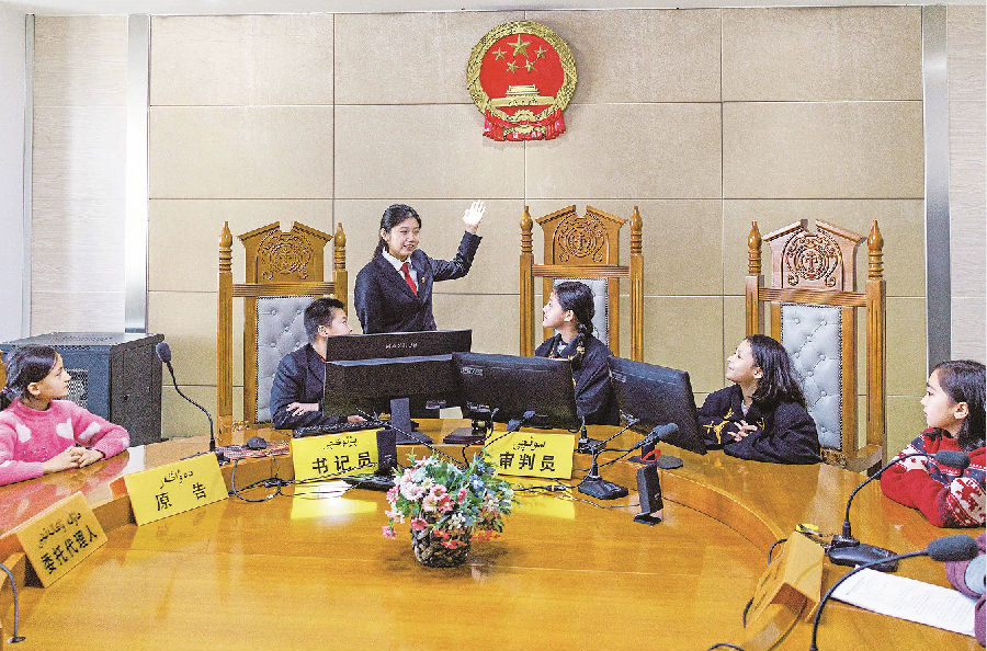 12月4日,乌鲁木齐市沙依巴克区友好南路街道金色花苑社区青少年到沙依巴克区人民法院参观研学。图为该院法官助理在少年家事审判庭向孩子们介绍法庭功能,为后续组织孩子们开展模拟法庭活动做准备。 孙振嵩 摄