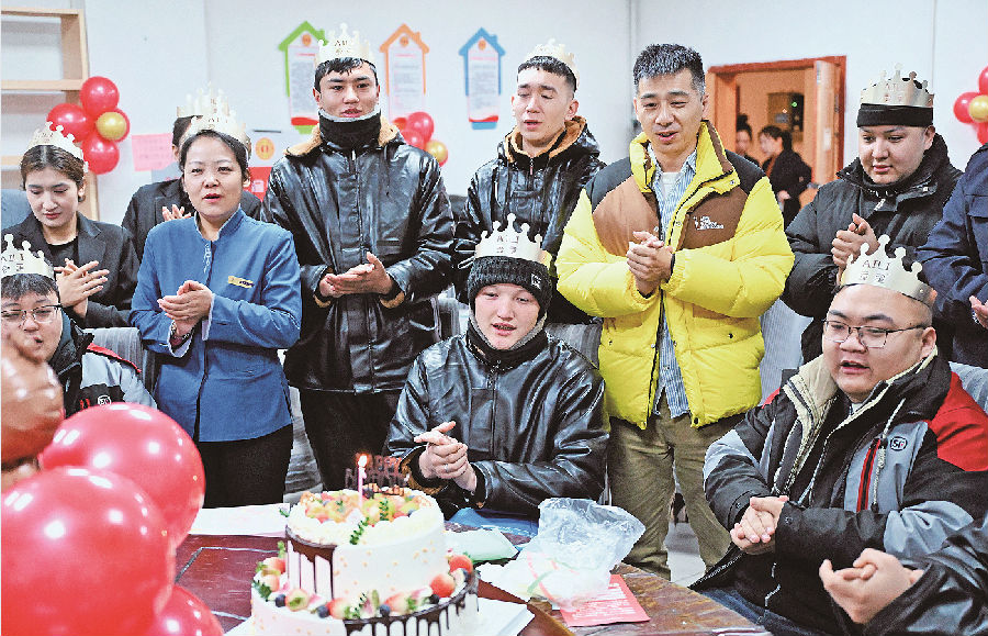 12月4日,乌鲁木齐市沙依巴克区红庙子街道工会联合塞外江南大饭店工会驿站,为辖区外卖员、快递员等新就业群体举办集体生日会。图为寿星们和工会工作人员同唱生日歌。