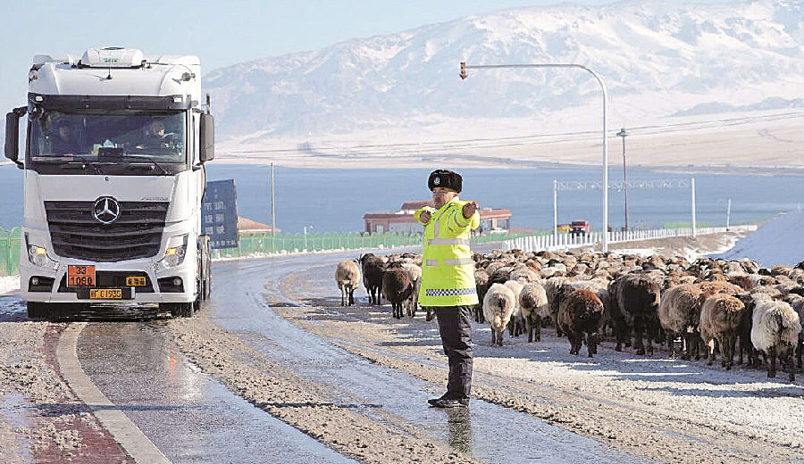 11月30日,霍城县公安局交管大队民警守护羊群安全转场。受访单位供图