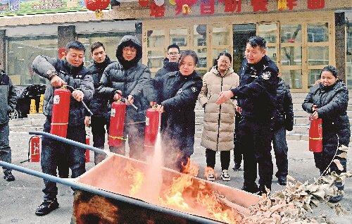 12月15日,乌鲁木齐市公安局沙依巴克区分局友好南路街道派出所民警指导辖区商户正确使用灭火器。