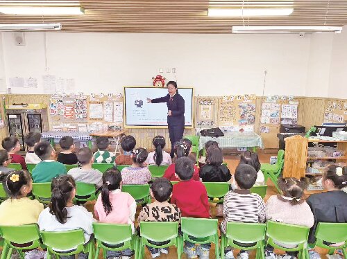 近日,吉木萨尔县人民法院五彩湾人民法庭法官杨晓毅走进五彩湾幼儿园,以趣味互动形式开展法治启蒙教育活动。杨晓毅遵循幼儿认知规律,用孩子们听得懂、学得会的方式,围绕“不跟陌生人走”“保护身体小秘密”“遵守交通规则”3个重点展开讲解。图为杨晓毅向孩子们讲解法官的职能作用。