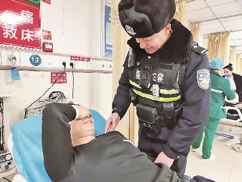 2025年2月5日,库尔勒市公安局萨依巴格街道派出所辅警麦麦提艾力·吐尔逊晕倒送医后,同事们去看望他。 高珊珊 摄