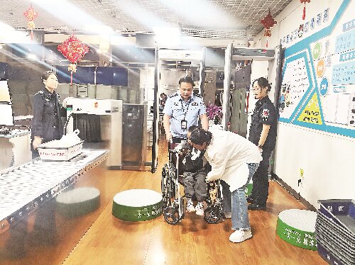 2025年9月28日,在库车龟兹机场安检区,库车市公安局机场派出所民警与工作人员协助坐轮椅的儿童过安检。 张晶 摄