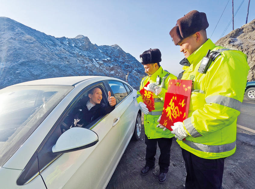 A+ | a2月2日,库尔勒市公安局交通管理大队塔什店中队组织执勤民辅警在G216线春运服务站、流动执勤点和滑雪场开展春运主题宣传和送安全、送服务、送祝福活动。