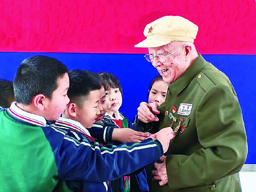 孩子们抚摸闫欣秋胸前的勋章。 赵睿 摄