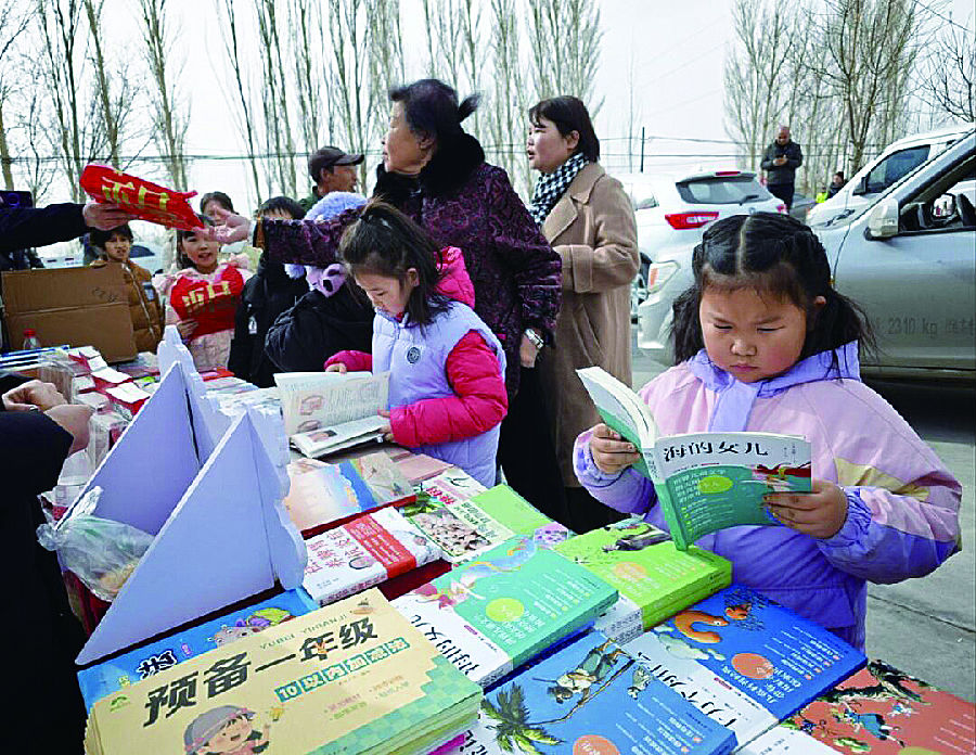 近日,在焉耆回族自治县包尔海乡巴扎日流动书摊,家长带着孩子阅读、选购书籍。