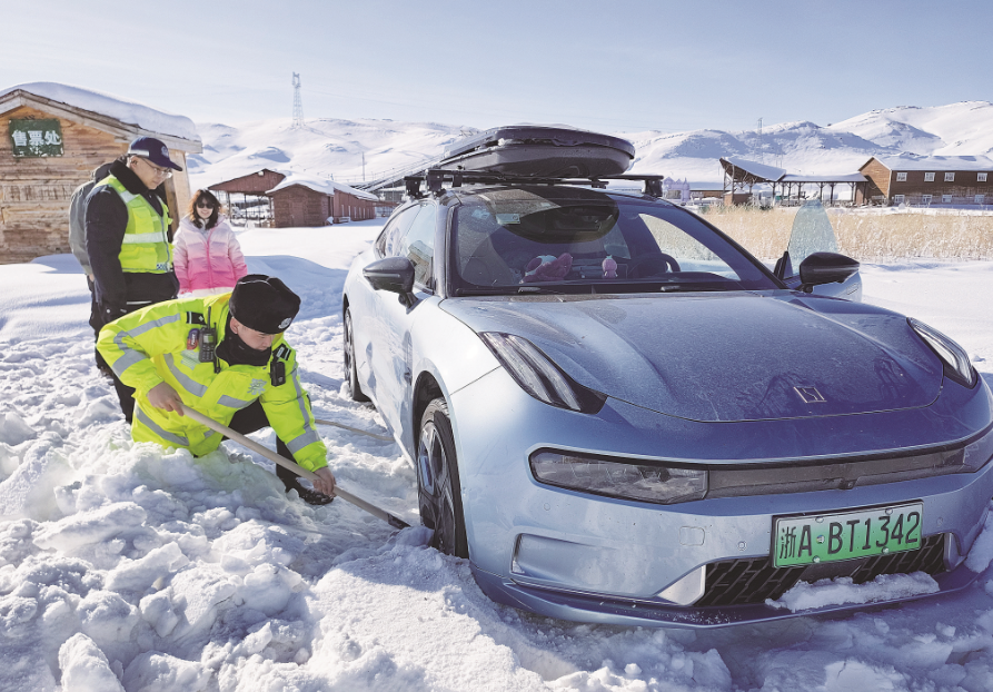 2月21日16时,在可可苏里景区某路段,富蕴县公安局交管大队民警帮陷入积雪的车辆脱困。