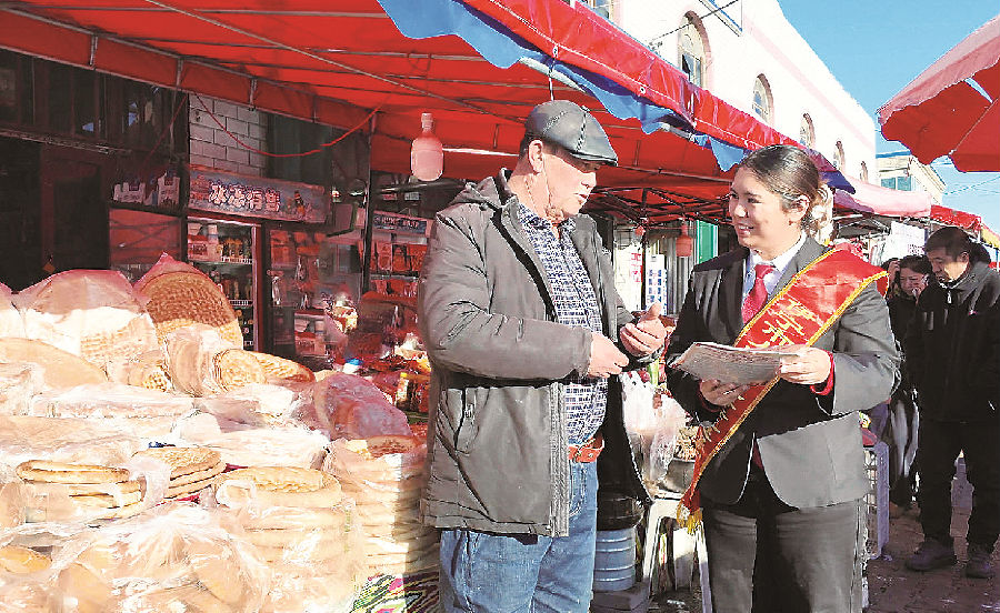 近日,伊宁市人民法院立案庭干警向商户普及《中华人民共和国食品安全法》相关规定。