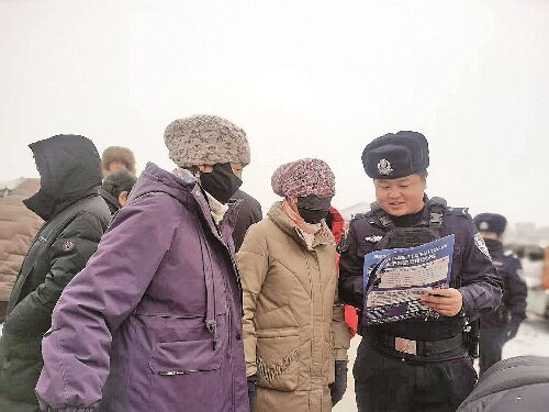 3月3日,乌鲁木齐市公安局高新区(新市区)分局安宁渠镇派出所辅警在惠农集市向群众宣讲反诈知识。 黄芳 摄