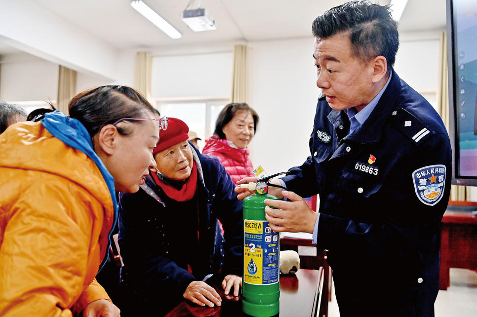 A+ | a3月16日,乌鲁木齐市沙依巴克区八一街道古城南社区联合乌市公安局沙区分局八一街道派出所,在辖区开展反诈与消防安全宣传活动。图为民警为居民讲解灭火器的正确使用方法。