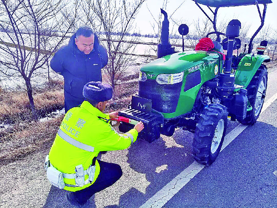 3月18日,兵团第六师奇台垦区公安局交管大队民警为农机贴反光贴。连日来,该大队民警走进乡村街巷、农资集市,向职工群众、农机驾驶人讲解道路交通安全注意事项,提醒大家严禁农用车、三轮车违法载人、人货混装,坚决杜绝酒后驾驶、疲劳驾驶、无证驾驶等违法行为。 朱正 摄