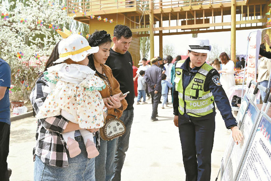 4月14日,轮台县公安局交警大队民警在辖区梨园向游客宣传道路交通安全知识。 姚才祖 摄