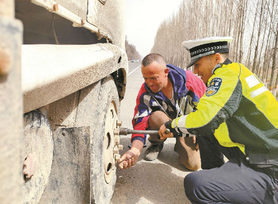4月13日15时30分,温泉县公安局交警大队民警巡逻时,看到一辆轻型普通货车因爆胎无法行驶。得知驾驶人没有换胎经验,民警立即上前帮忙更换备用轮胎。20分钟后,轮胎换好了。临行前,民警叮嘱驾驶人备胎不能长时间使用,要尽快前往修理厂更换轮胎,确保行车安全。 王鹏举 摄