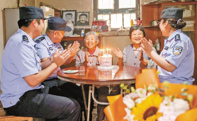 图为民警们与汤奶奶(右二)一起给田奶奶(中)过80岁生日。